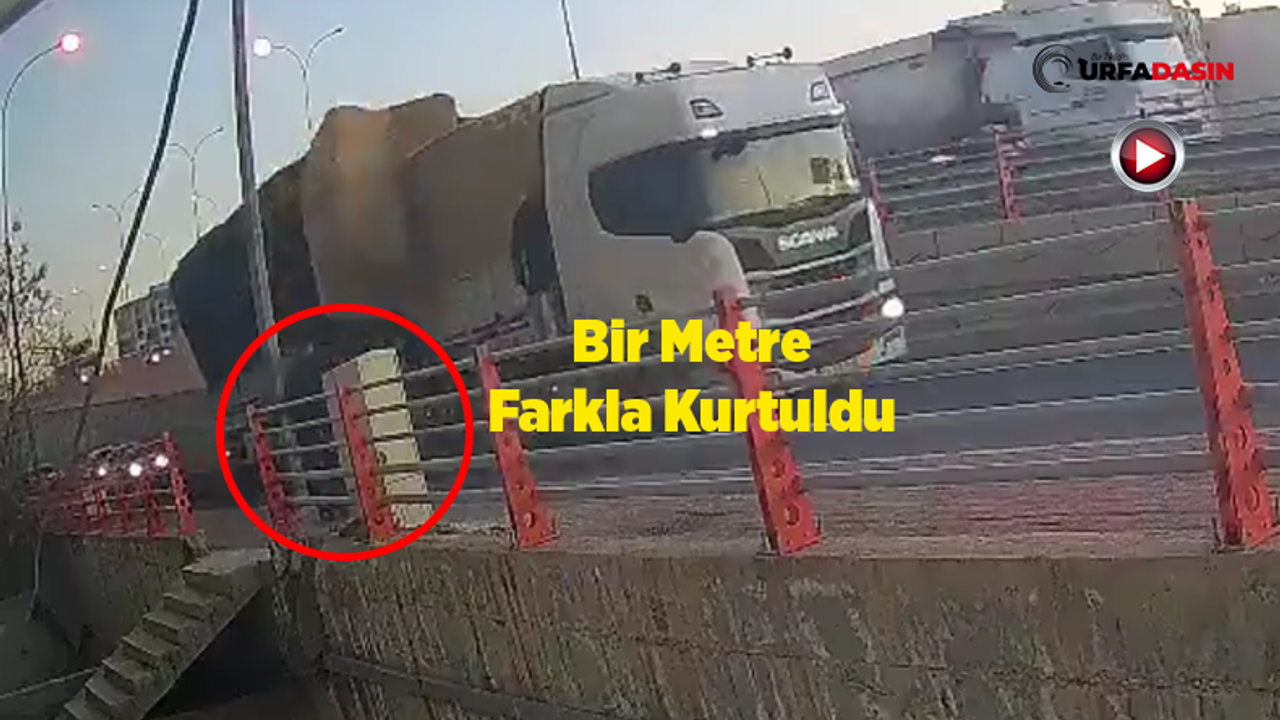Şanlıurfa'da bir iş yerinin güvenlik kamerasına yansıyan görüntüye göre, OSM Köprülü Kavşağı'nda kaldırımda yürüyen bir kişinın yanındaki yoldan geçen kamyondan kilolarca ağırlıktaki saman balyası kaldırıma düştü.